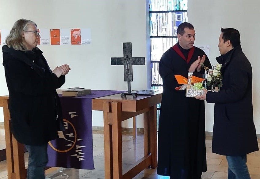 Applaus für Dr. Pham Hai Dang Le (re). Lange Jahre gestaltete er die Gottesdienste der Versöhnungskirche in Passau-Neustift musikalisch. Schulreferent Oliver Weindel (Mitte) und Kirchenvorsteherin Dr. Barbara Fincke-Melke (li) haben am Sonntag, 18. Februar den langjährigen Organisten der Passauer Versöhnungskirche Dr. Pham Hai Dang Le nun verabschiedet.